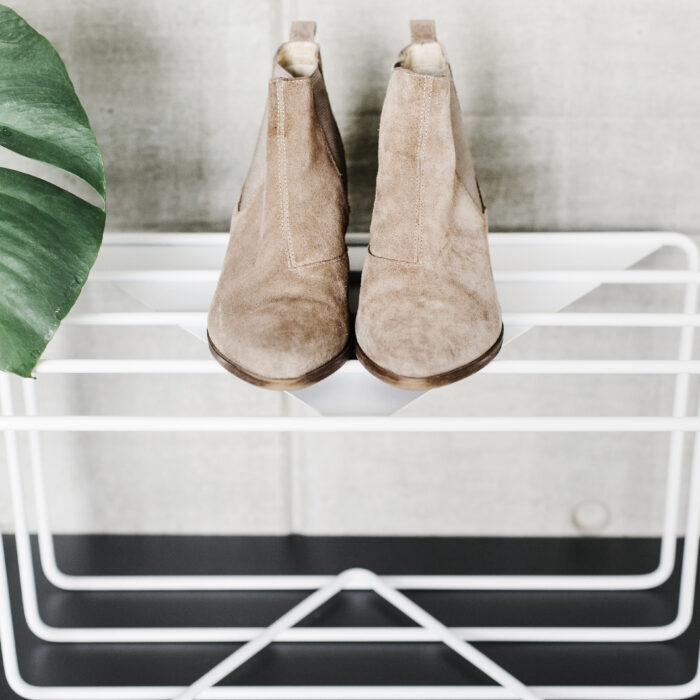 Une décoration nordique et minimaliste grâce au support à chaussures Lume en acier blanc